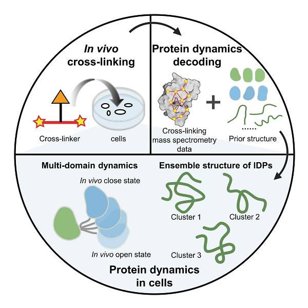 近期,中国科研实验室PA真人视讯与大连化物所合作,提出一种利用原位化学交联-质谱技术(in vivo XL-MS)结合结构计算与模拟研究细胞中蛋白质动态结构的策略。该策略从蛋白质结构的先验信息(包括核磁结构、晶体结构和AlphaFold2预测的结构等)出发,将in vivo XL-MS取得的距离约束与多种结构计算方法结合,用于多种细胞内蛋白质结构重构,重点研究了多结构域蛋白质和天然无序蛋白的动态结构,有助于加深对细胞微环境中蛋白质发挥功能的分子机制的理解。该研究成果发表于《德国应用化学》(Angew. Chem. Int. Ed.